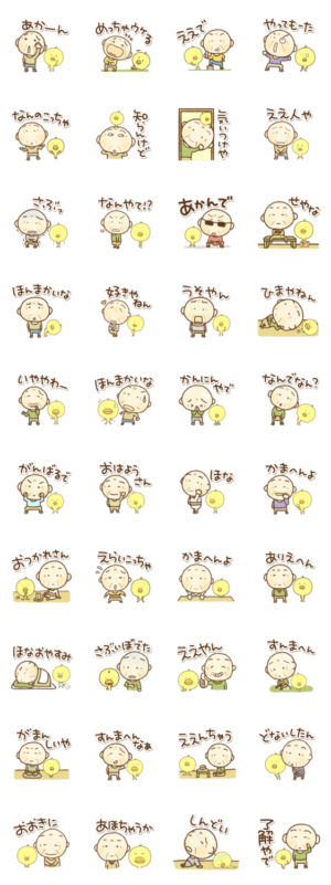 関西弁の愉快なおっさんとひよこ スタンプに書いてある文字一覧