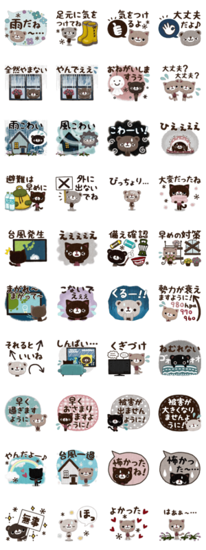 不安定な天候が多くなる季節に使えるスタンプのセットです。梅雨の時期から台風のシーズンまで、不安な時のやりとりに。ゲリラ豪雨などにも。