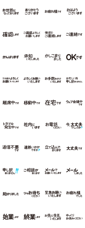 ●シンプル黒文字●キャラなし●敬語&丁寧語:目上の方やシニア世代との連絡にも●ビジネス版:在宅勤務,リモートワークに●省スペース版:文字の大きい縦書き版もあり。MK works より発売