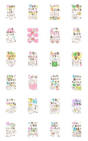 ねことうさぎの名前スタンプシリーズ。大きく飛び出すスタンプです。やさしい気づかい言葉。山田まぽん作。
