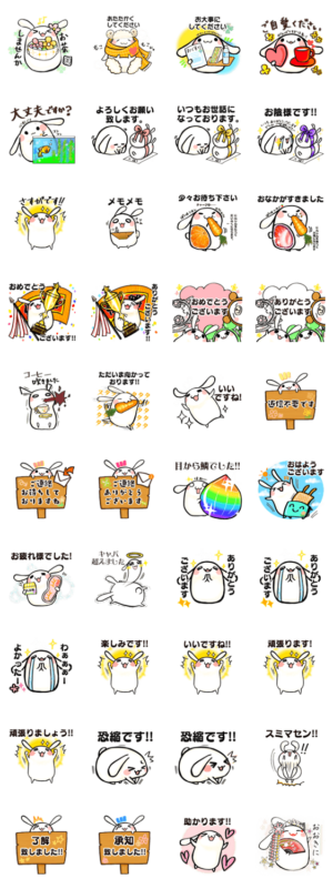 敬語で元気に敬意を払っていくだいふくうさぎ。 ご自愛/お大事に/よろしく/優勝/おめでとう/ありがとう/仕事/吹く/いちご大福/メモ/お疲れ様/おはようございます/おおきにas より発売
