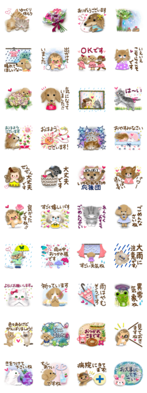 敬語が多めのセットで、日常言葉に加え、雨の日に使えるスタンプもたくさんあります。いろいろなシチュエーションに使える便利な文字なしスタンプは、5つ入っています♡