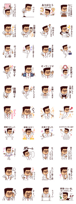 ぷりてぃマダム似の中年。サラリーマンのコスプレ萌えな大人女子から、仕事好きの大人男子まで。先輩・後輩にも、ゆるい敬語スタンプを。母の日、父の日のプレゼントにも。KAGE310 より発売