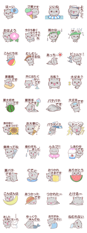 アメリカンショートヘアの『アメっち』の【夏】編です。暑いときや、夏のシーンで使える猫スタンプです。スコティッシュフォールド等の、ねこ好きの方にもぜひ。【かたこ】