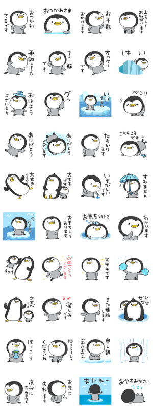 ふわっとペンギン。敬語編。「承知しました」「よろしくおねがいします」から「お気をつけて」まで。丁寧な言葉で、日常生活のあいさつをかわそう。Mami / エストループ より発売