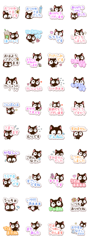 『小さい黒猫スタンプ』から、『シンプル返信』編です。毎日使える、いろいろな感情や、気持ちなどを集めました。ねこ好きな方にぜひ。【かたこ】