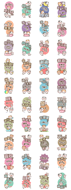 たれ耳ニャンコシスターズの「でか文字」中国語&日本語スタンプです♪ 日常よく使う言葉を集めました♫ 国内&海外の友人や家族とバイリンガルに会話を楽しんでくださいね♫ ※このスタンプはトークルームで大きく表示されるBIGスタンプです。プリン より発売