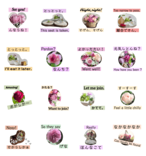 50代の女性たちが、久留米にいるお友達に送りたい久留米弁と英語と薔薇のスタンプ。Rosy Cozy より発売