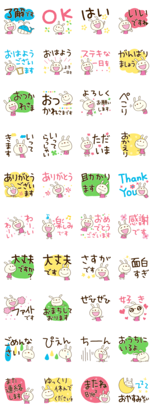 「わーいわーい」「感謝です」から「また連絡します」まで。大きな文字で見やすい日常言葉集。てるてるうさぎで、シンプルにメッセージを届けよう。