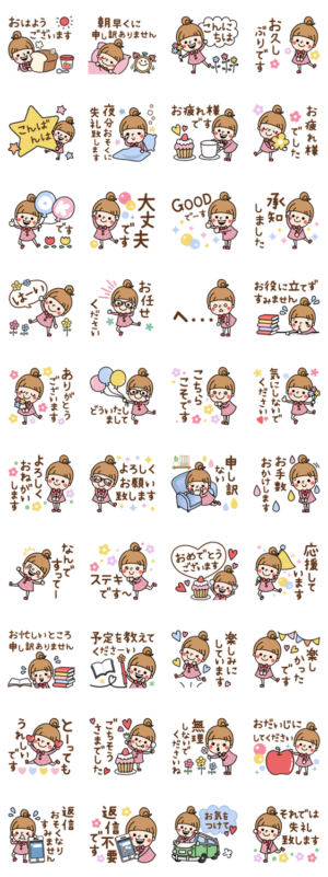 おだんごヘアーの可愛い女の子。毎日の生活にも仕事にも使える!!敬語スタンプが盛り沢山。