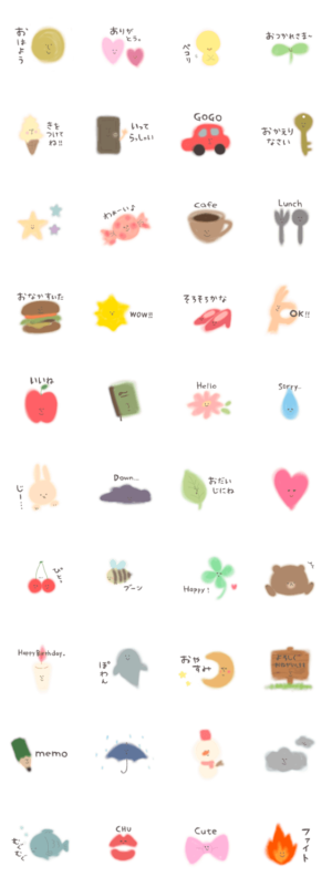 ゆる~くふんわり、絵本のようなかわいいスタンプです。子育てママさんから、彼氏彼女、ともだちまで。絵文字・顔文字派の方にも使いやすい、シンプルなことばをチョイス♪
