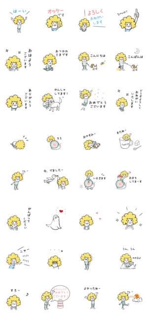 ふわふわっとしたキャラクターのユルめなスタンプをどうぞ、どうぞ。