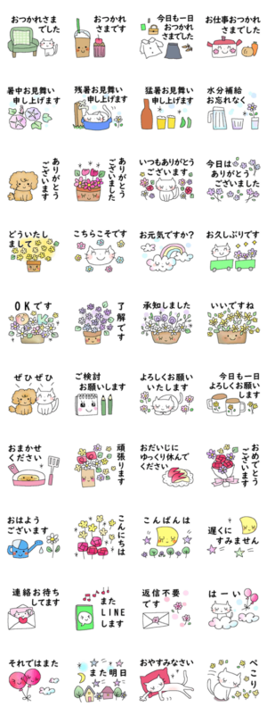 花いっぱい、教科書文字の見やすい40個。猫とトイプードルの人気コンビがかわいい、大人の優しい思いやりスタンプです。夏の気づかい、暑中お見舞いなども便利です。