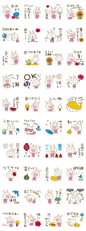 「今日もあついね〜」「夏だよー」から「ゆっくり休んでね」まで。夏の季節にピッタリの言葉を集めたスタンプ集。てるてるうさぎで、夏の暑さを吹き飛ばそう。
