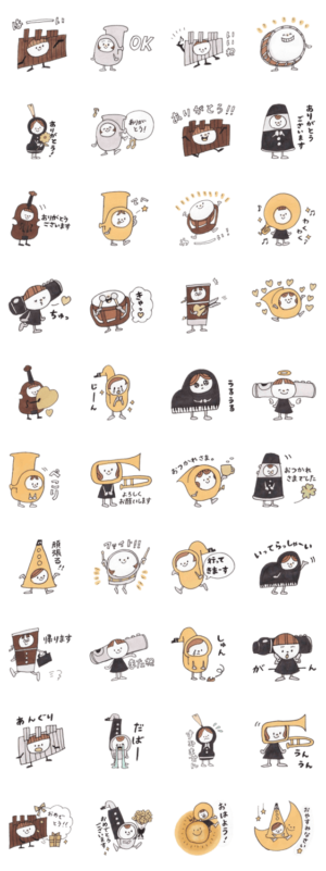 吹奏楽やオーケストラ、クラシックにジャズ、ピアノ!音楽好きな楽器たちのスタンプ第二弾!okadamae より発売