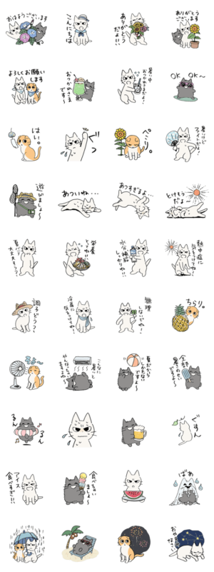 夏をエンジョイしているねこたちのスタンプです。にぎやかなスタンプをラインに飾ってトークを盛り上げましょう!