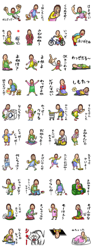 鹿児島県のお母さんスタンプ第2弾です。鹿児島県に住んでいる、元気なお母さんが、鹿児島県の方言、鹿児島弁を喋ります。今日も猫がお母さんにじゃれてます。