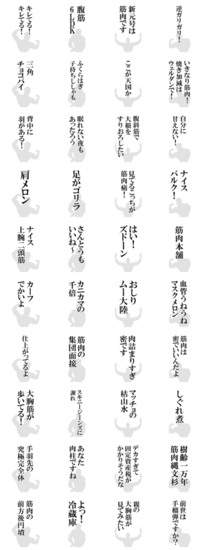 いま密かに話題のボディビルの掛け声です。筋トレやダイエットしている人、筋肉自慢している人、マッチョな人に送ると喜ばれます。筋肉は裏切らない。 ※このスタンプはトークルームで大きく表示されるBIGスタンプです。ナカムラ より発売