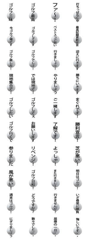 ゴルフ最高!ゴルフ楽しい!ゴルフ部の方、打ちっぱなし趣味の方、ゴルフ場最高!ゴルフボールと文字だけのシンプルスタンプ。大きいのでとても見やすいスタンプです。 ※このスタンプはトークルームで大きく表示されるBIGスタンプです。MD Studio より発売