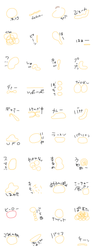 普通、食パン、キレる、ぐちゃぐちゃ、ため息、笑い、泣き、怒る、輪ゴム、しゅん、きゅん、プンプン、喧嘩、仲良し、カレー、バナナ、UFO、パソコン、いいね、ラーメン、junzo より発売