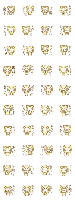 了解、おっけー、など毎日使う承知の返事がいっぱいなので、相手に合わせて、気持ちに合わせて使い分け。着ぐるみかぶった女の子です。