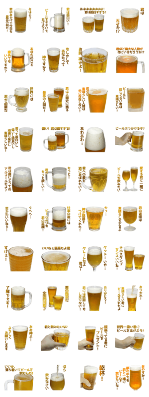 ビールがただ褒めてくれるシュールなスタンプ。全部ちゃんとした褒め言葉を使っているのもポイント。ビール好きなら購入してみては?