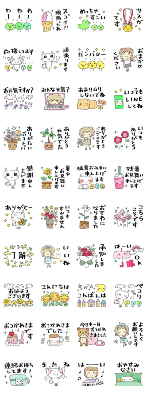 文字が大きくて見やすい、応援に特化した40個。夏の気づかいや暑中見舞い、便利で使いやすいスタンプです。(花、小鳥、うさぎ、女の子のキャラクターなど)敬語多めです。