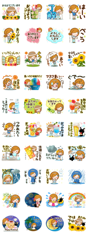 敬語も入った日常に便利な大人かわいい夏スタンプ、カスタムバージョンです♪やさしい黒猫ちゃんも一緒♪少しでも癒されますように。 「ほのぼのカノジョ」シリーズ