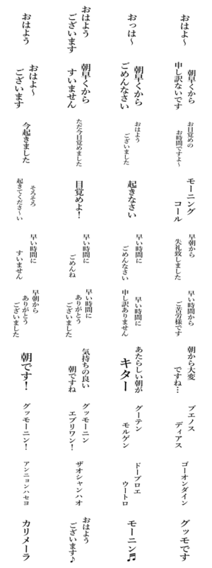 朝、朝早くに使う挨拶のスタンプです。いろんな国のおはようございますも収録しています。敬語、丁寧語で朝の挨拶。ラインのやり取りで使う早朝の表現がいろいろあります。 ※このスタンプはトークルームで大きく表示されるBIGスタンプです。MD Studio より発売