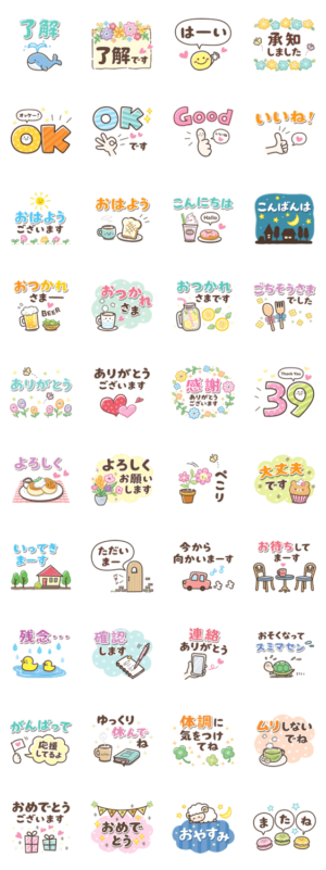 毎日使えて便利な日常会話のスタンプです。使用頻度が高い言葉をそろえ、老若男女を問わず使いやすいイラストのスタンプです。