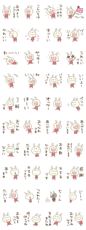 「かわいい」「ペコリ」から「ステキな一日を」まで。ちょっぴり落ち着いた色合いのスタンプ集。てるてるうさぎで、シンプルに日常メッセージを届けよう。
