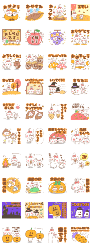 ウサコ&ネココ第4弾。秋(あき)バージョンです。日常で使える「おはよう・おつかれさま・了解・おめでとう・ありがとう」などの他に秋の行事(ハロウィーン)など40種です。