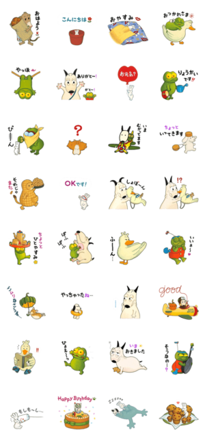島田ゆかのベストセラー絵本シリーズ「バムとケロ」がスタンプになったよ。 バムとケロはもちろん、かいちゃんやヤメピ、おじぎちゃんなどの仲間たちも勢ぞろい!島田ゆか より発売