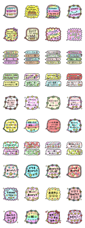 誕生日、おめでとう、ありがとう、メッセージをふきだしにしたセットです。カラフルでかわいいスマイルがシンプルで使いやすいと思います。敬語、関西弁もあります。eko より発売