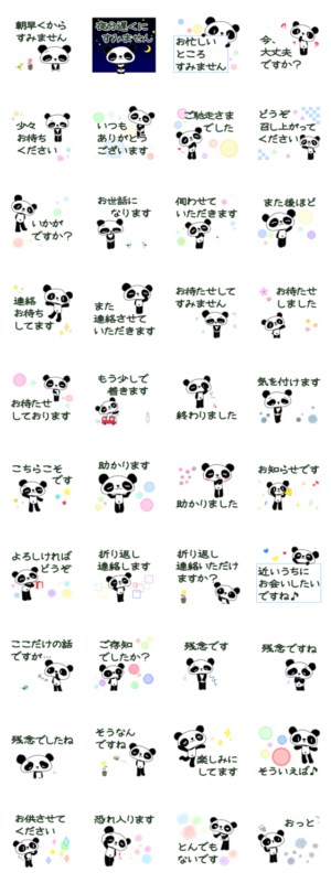 パンダが敬語で挨拶をしたり、気遣いをしたり。「連絡お待ちしてます」や「お世話になります」「恐れ入ります」など会話に使いやすいスタンプです♪