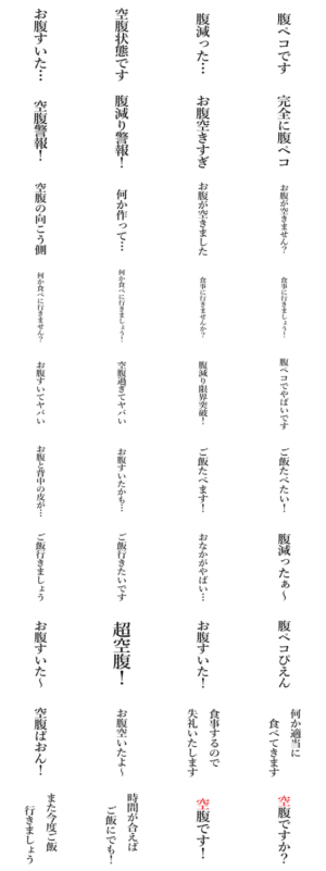 文字のみの空腹、腹ペコ、お腹が空いたなどの気持ちを伝えるためだけのシンプルで使いやすいスタンプです。食事をちゃんととって、栄養補給もばっちり! ※このスタンプはトークルームで大きく表示されるBIGスタンプです。MD Studio より発売