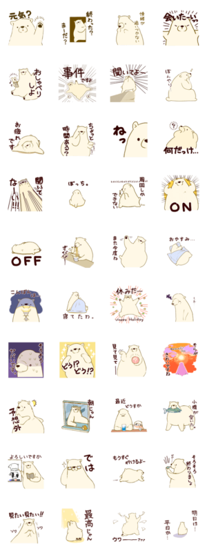 雪国トリオのしろくまさんメインのスタンプです。ほのぼのとした日常会話などにお使いください。チャイ より発売