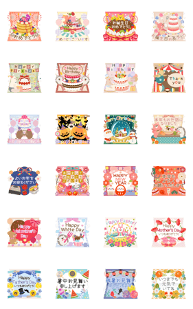 happybirthday、おめでとう、ありがとう、お祝い、結婚、年末年始お正月年賀状、バレンタイン&ホワイトデー、父母の日、暑中残暑見舞い、ハロウィン、クリスマス、季節他