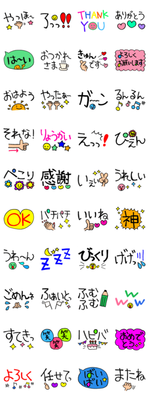 シンプルな文字メインの大きい文字のスタンプ。日常会話で毎日使えます。デカ文字なので、シニア世代の方にもオススメです。スマイルもついています。