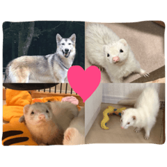フェレット三姉妹のAgeha(シルバーミット)、ティアラ(シャンパン)、ミルク(アルビノ)と狼犬の牙狼(ウルフドッグ)の日常生活スタンプたにさき より発売