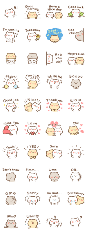 日常のあいさつで使えるシンプルかわいいねこの英語スタンプです。con より発売