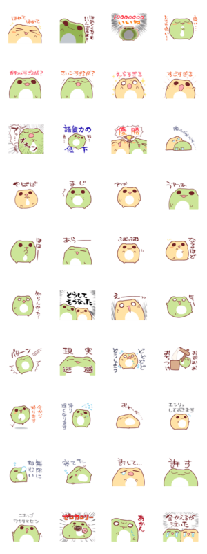 ころころとした大福のようなカエルのスタンプです。相槌や褒め言葉など、日常で使えるステッカーです。