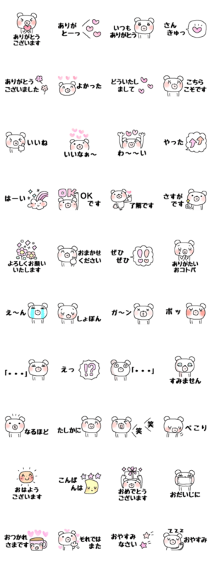 ちょうどいいサイズ感で文字は大きめ、くっきり見やすい40個。人気の絵文字「ふんわりくまさん」が大人やさしいスタンプに。シンプルで使いやすいちょっと省スペースです。