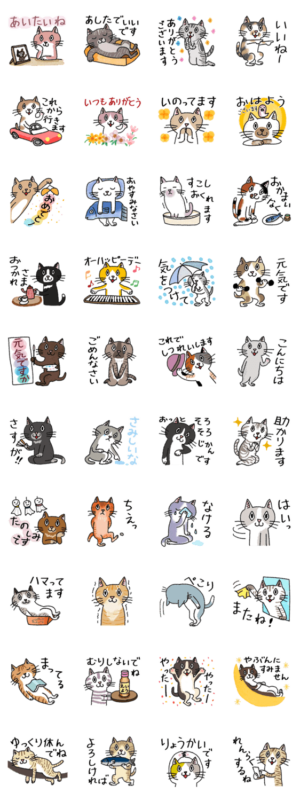 手描きイラストのようなねこの文字入りスタンプです。にぎやかなスタンプをラインに飾ってトークを盛り上げましょう!