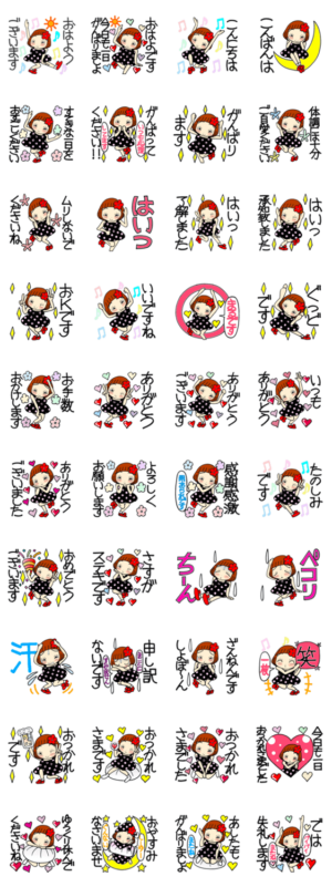 水玉の黒いワンピースがかわいい女の子のキャラクターのスタンプです。