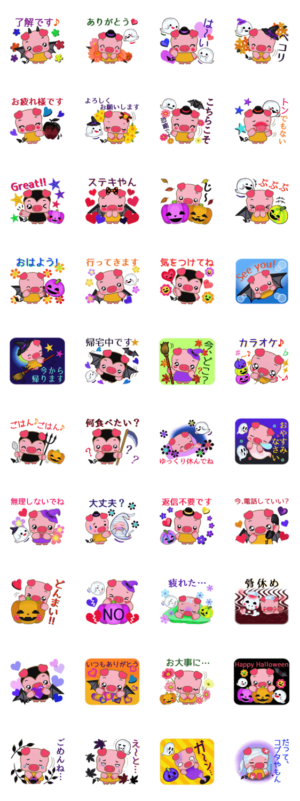 コブタが秋とハロウィンの仮装を楽しんでいますが、デカ文字で、よく使う言葉や挨拶、帰るコールがありますので長くお使い頂けます。ぶた好きな方は是非お試しください。Muguet より発売