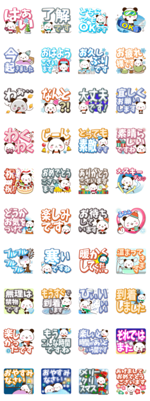 大きいデカ文字で読みやすい、冬の敬語のパンダスタンプです。メリークリスマス・お正月のあけましておめでとうございますなども入っています♪