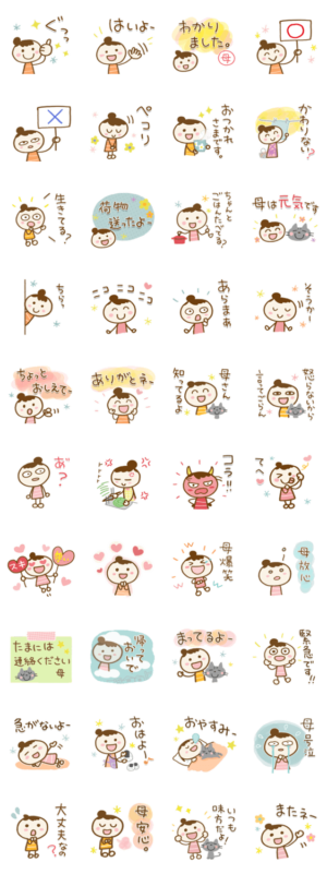 お母さんが毎日使えるスタンプです。離れて暮らしている家族へのスタンプとしても使えます。母/お母さん/家族/おかん