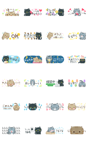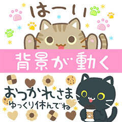 黒猫・サバトラ・茶トラのいつも仲良し3匹の猫のスタンプは省スペースだけど賑やかに背景が動くエフェクトスタンプです。
