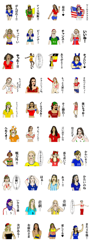 サッカー通なら使いこなせるスタンプ5弾は、世界の美女サポーター!サッカーマニアのグループラインで盛り上がること間違いなし。日常でも使えるサッカーあるあるが集約。
